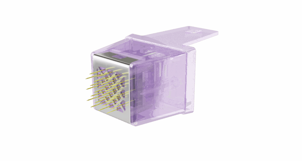 Durante o procedimento, microagulhas de ouro penetram a pele em profundidades controladas, variando de 0,5 mm a 7 mm, e liberam energia de radiofrequência bipolar fracionada diretamente na derme. Essa energia gera aquecimento controlado que causa a contração imediata das fibras de colágeno e estimula a neocolagênese, resultando em pele mais firme, elástica e uniforme.